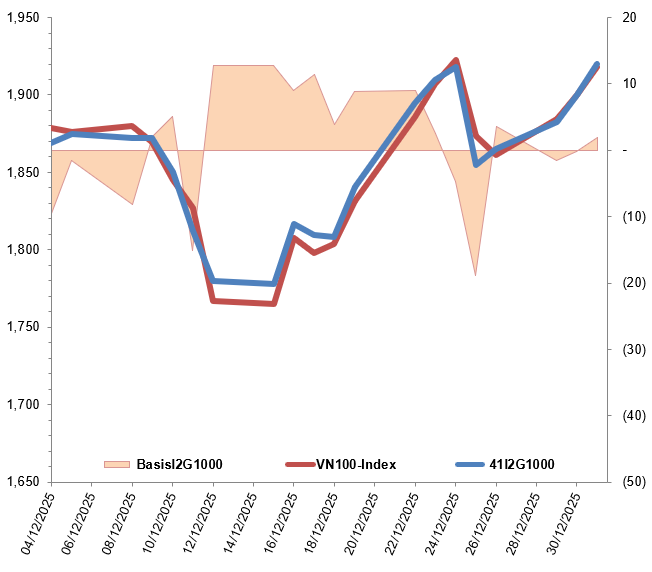 Ngoài ra, các hợp đồng tương lai VN100 đồng loạt tăng điểm trong phiên giao dịch ngày 31/12/2025. Cụ thể, 41I2G1000 (I2G1000) tăng 1.04%, đạt 1,919.9 điểm; 41I2G2000 (I2G2000) tăng 1.06%, đạt 1,908.1 điểm; hợp đồng 41I2G3000 (I2G3000) tăng 1.81%, đạt 1,913 điểm; hợp đồng 41I2G6000 (I2G6000) tăng 0.8%, đạt 1,894 điểm. Chỉ số cơ sở VN100-Index kết phiên ở mức 1,918 điểm.