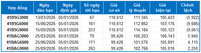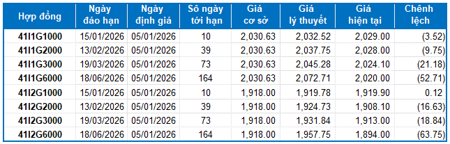 Dựa trên phương pháp định giá hợp lý với thời điểm khởi đầu ngày 05/01/2026, khung giá hợp lý của các hợp đồng tương lai đang được giao dịch trên thị trường được thể hiện như sau:
