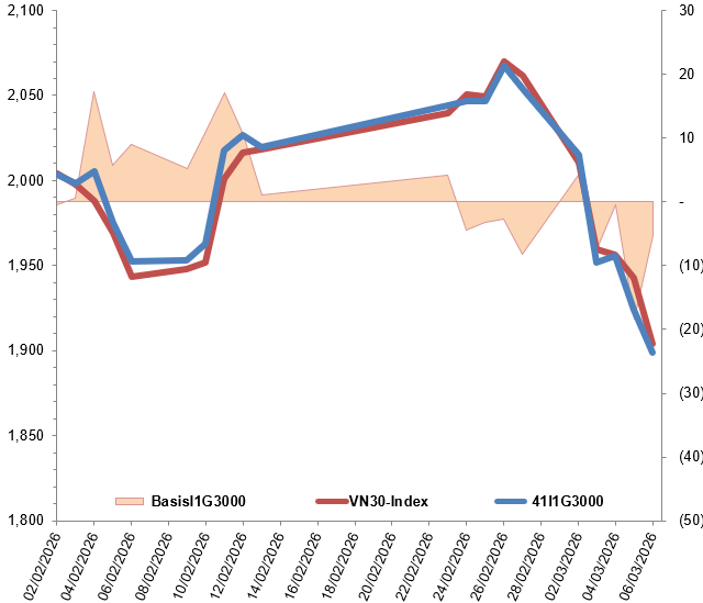 Các hợp đồng tương lai VN30 đồng loạt giảm điểm trong phiên giao dịch ngày 06/03/2026. Cụ thể, 41I1G3000 (I1G3000) giảm 1.33%, còn 1,898.9 điểm; 41I1G4000 (I1G4000) giảm 1.09%, còn 1,901 điểm; hợp đồng 41I1G6000 (I1G6000) giảm 1.17%, còn 1,911 điểm; hợp đồng 41I1G9000 (I1G9000) giảm 1.3%, còn 1,905 điểm. Chỉ số cơ sở VN30-Index kết phiên ở mức 1,904.19 điểm.