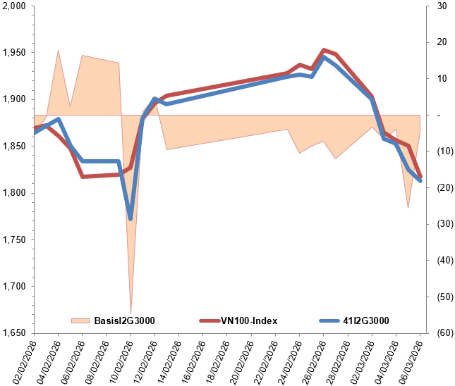 Ngoài ra, các hợp đồng tương lai VN100 hầu hết đều giảm trong phiên giao dịch ngày 06/03/2026. Cụ thể, 41I2G3000 (I2G3000) giảm 0.65%, còn 1,813.1 điểm; 41I2G4000 (I2G4000) giảm 1.07%, còn 1,817.6 điểm; hợp đồng 41I2G6000 (I2G6000) giảm 2.33%, còn 1,795.1 điểm; hợp đồng 41I2G9000 (I2G9000) tăng 0.93%, đạt 1,846.8 điểm. Chỉ số cơ sở VN100-Index kết phiên ở mức 1,817.73 điểm.