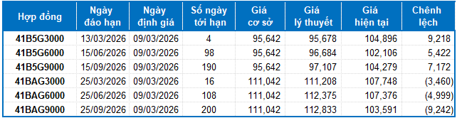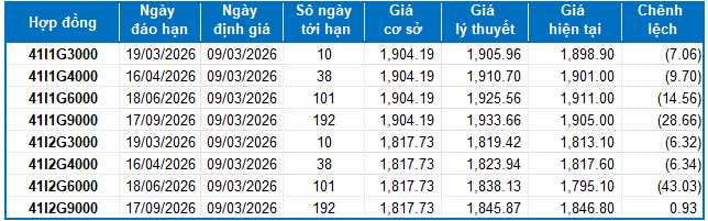 Dựa trên phương pháp định giá hợp lý với thời điểm khởi đầu ngày 09/03/2026, khung giá hợp lý của các hợp đồng tương lai đang được giao dịch trên thị trường được thể hiện như sau:
