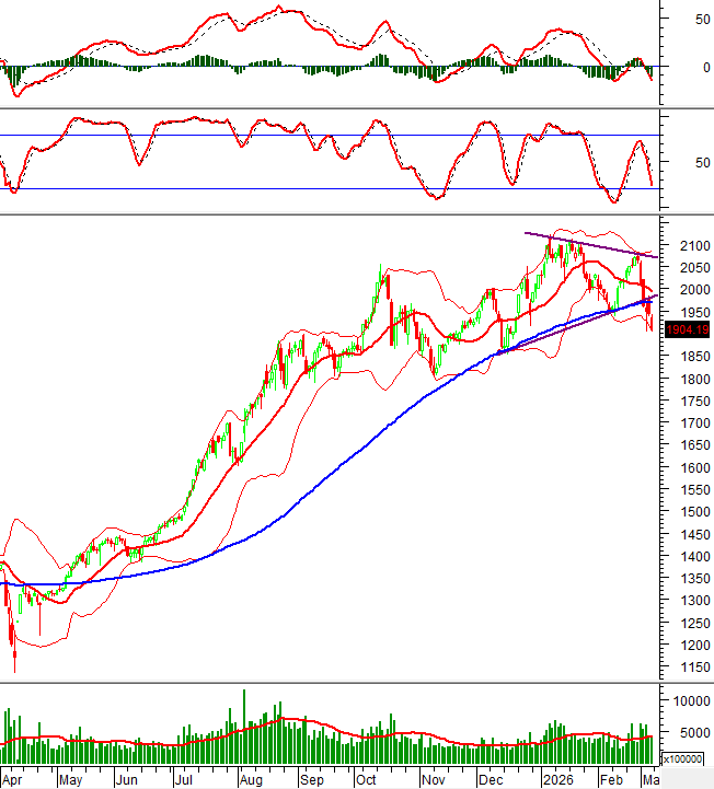 Hiện tại, chỉ số đang tiến về gần đáy cũ tháng 12/2025 (tương đương vùng 1,855-1,890 điểm) trong khi chỉ báo MACD tiếp tục mở rộng khoảng cách với đường Signal sau khi cho tín hiệu bán và nằm dưới mức 0 cho thấy triển vọng tiếp tục tiêu cực.