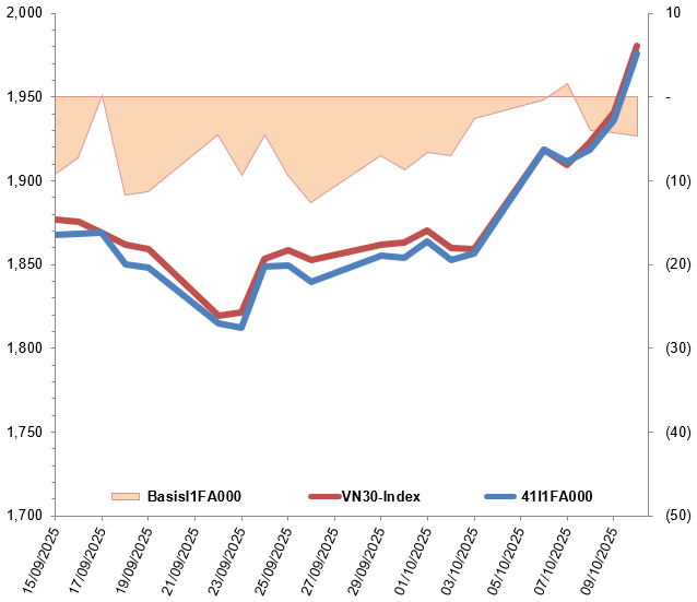 Các hợp đồng tương lai đồng loạt tăng điểm trong phiên giao dịch ngày 10/10/2025. Cụ thể, 41I1FA000 (I1FA000) tăng 2.03%, đạt 1,975.9 điểm; 41I1FB000 (I1FB000) tăng 1.96%, đạt 1,968 điểm; hợp đồng VN30F2512 (F2512) tăng 1.82%, đạt 1,965 điểm; hợp đồng 41I1G3000 (I1G3000) tăng 1.57%, đạt 1,936.2 điểm. Chỉ số cơ sở VN30-Index kết phiên ở mức 1,980.57 điểm.