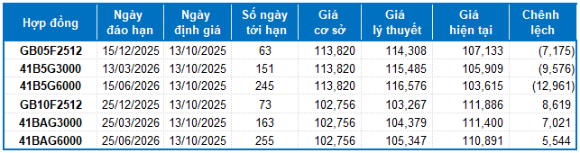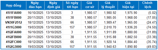 Dựa trên phương pháp định giá hợp lý với thời điểm khởi đầu ngày 13/10/2025, khung giá hợp lý của các hợp đồng tương lai đang được giao dịch trên thị trường được thể hiện như sau: