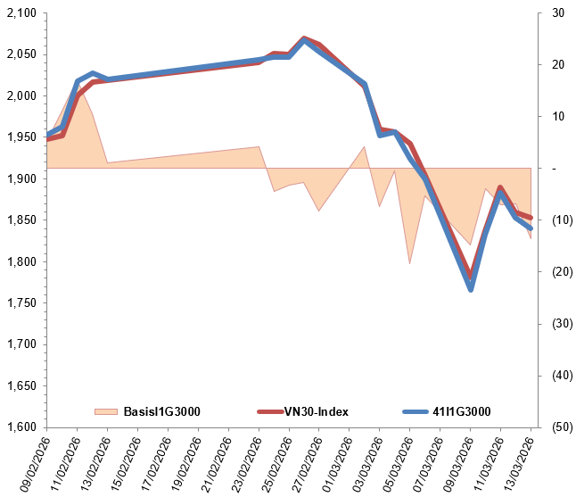 Các hợp đồng tương lai VN30 đồng loạt giảm điểm trong phiên giao dịch ngày 13/03/2026. Cụ thể, 41I1G3000 (I1G3000) giảm 0.7%, còn 1,840 điểm; 41I1G4000 (I1G4000) giảm 0.92%, còn 1,835 điểm; hợp đồng 41I1G6000 (I1G6000) giảm 1.19%, còn 1,833 điểm; hợp đồng 41I1G9000 (I1G9000) giảm 0.69%, còn 1,843.5 điểm. Chỉ số cơ sở VN30-Index kết phiên ở mức 1,853.60 điểm.