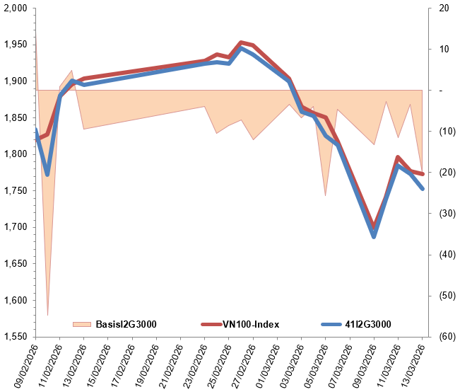 Ngoài ra, các hợp đồng tương lai VN100 hầu hết đều giảm trong phiên giao dịch ngày 13/03/2026. Cụ thể, 41I2G3000 (I2G3000) giảm 1.15%, còn 1,752.6 điểm; 41I2G4000 (I2G4000) giảm 0.05%, còn 1,761 điểm; hợp đồng 41I2G6000 (I2G6000) giảm 0.72%, còn 1,754 điểm; hợp đồng 41I2G9000 (I2G9000) tăng 0.86%, đạt 1,780.6 điểm. Chỉ số cơ sở VN100-Index kết phiên ở mức 1,772.56 điểm.