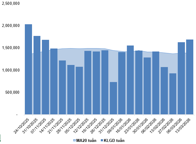 Khối lượng và giá trị giao dịch của thị trường phái sinh lần lượt tăng 12.61% và 12.61% so với phiên ngày 12/03/2026. Tính chung cả tuần, khối lượng và giá trị giao dịch tuần lần lượt tăng 3.38% và giảm 2.84% so với tuần trước.