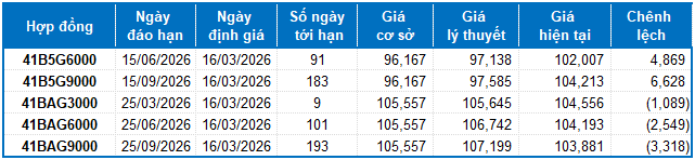 Dựa trên phương pháp định giá hợp lý với thời điểm khởi đầu ngày 16/03/2026, khung giá hợp lý của các hợp đồng tương lai đang được giao dịch trên thị trường được thể hiện như sau: