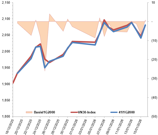 Khối ngoại quay lại mua ròng với tổng khối lượng mua ròng trong phiên giao dịch ngày 16/01/2026 đạt 2,234 hợp đồng. Cả tuần, khối ngoại mua ròng tổng cộng 1,440 hợp đồng.