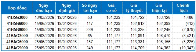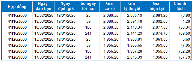 Dựa trên phương pháp định giá hợp lý với thời điểm khởi đầu ngày 19/01/2026, khung giá hợp lý của các hợp đồng tương lai đang được giao dịch trên thị trường được thể hiện như sau:
