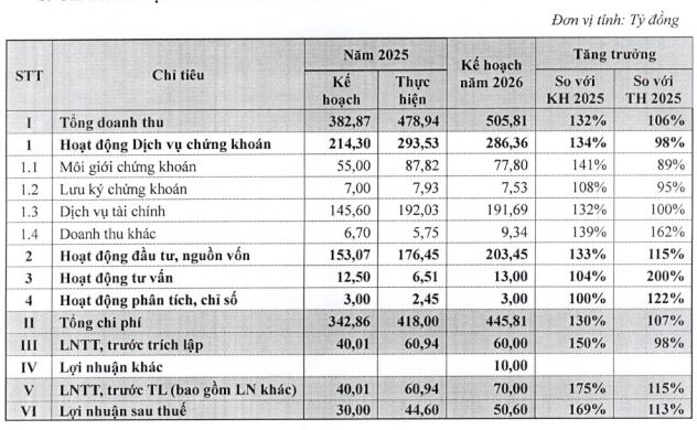 Trong bối cảnh dự báo môi trường kinh doanh như trên, với định hướng chiến lược đưa PSI trở thành công ty chứng khoán hoạt động theo mô hình ngân hàng đầu tư hoàn chỉnh trong lĩnh vực công nghiệp năng lượng, PSI đặt mục tiêu vốn chủ sở hữu năm 2026 đạt tối thiểu 800 tỷ đồng, hướng tới mục tiêu cung cấp đầy đủ các nghiệp vụ chứng khoán tới khách hàng, bao gồm cả nghiệp vụ chứng khoán phái sinh. Chỉ tiêu doanh thu 505.8 tỷ đồng và lợi nhuận sau thuế 50.6 tỷ đồng, lần lượt tăng 6% và 13%. Tổng tài sản năm 2026 đạt tối thiểu 3,600 tỷ đồng.