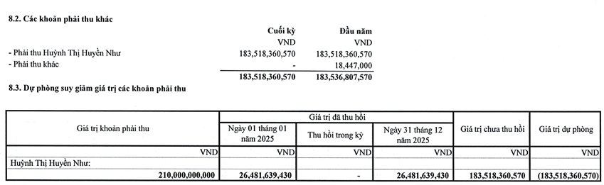 Bên cạnh đó, Công ty cho biết đang bán 2 tài sản thu được từ vụ kiện với Huỳnh Thị Huyền Như có giá trị khoảng 2.2 tỷ đồng. Đồng thời, Ban lãnh đạo sẽ tiếp tục theo dõi, đôn đốc và phối hợp với các cơ quan thi hành án để sớm thu hồi số tiền còn lại từ vụ án.