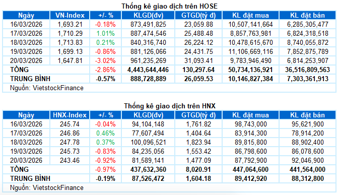 Giao dịch: Các chỉ số chính lao dốc trong phiên giao dịch ngày 20/03. VN-Index giảm mạnh 3.02%, xuống còn 1,647.81 điểm; HNX-Index giảm 0.92%, dừng tại 243.46 điểm. Xét cho cả tuần, VN-Index mất tổng cộng 48.43 điểm (-2.86%), trong khi HNX-Index giảm 2.38 điểm (-0.97%).