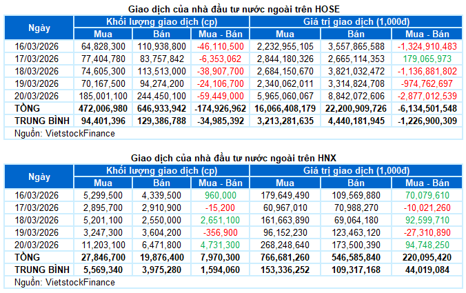 Nhà đầu tư nước ngoài bán ròng với giá trị 5.9 ngàn tỷ đồng trên cả hai sàn trong tuần qua. Trong đó, khối ngoại bán ròng 6.1 ngàn tỷ đồng trên sàn HOSE nhưng mua ròng hơn 220 tỷ đồng trên sàn HNX.