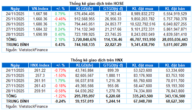 Giao dịch: Các chỉ số chính biến động trái chiều trong phiên giao dịch ngày 28/11. VN-Index tăng 0.4%, lên mức 1,690.99 điểm. Trong khi đó, HNX-Index giảm 0.58%, xuống còn 259.91 điểm. Xét cho cả tuần, VN-Index có thêm tổng cộng 36.06 điểm (+2.18%), trong khi HNX-Index mất 3.22 điểm (-1.22%).