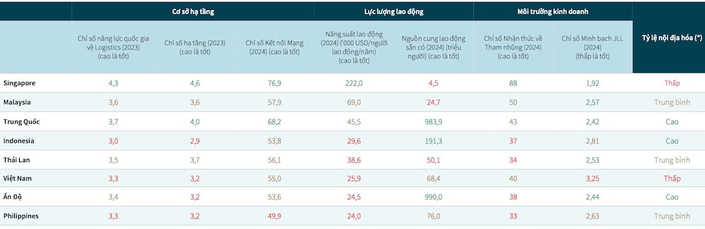 Theo bộ tiêu chí đánh giá của JLL, khi so sánh các quốc gia trong khu vực theo hai nhóm yếu tố gồm tài chính (chi phí đất, lao động, điện nước…) và phi tài chính (hạ tầng, môi trường đầu tư, thủ tục hành chính, minh bạch thông tin…), Việt Nam đứng thứ tư, sau Ấn Độ, Thái Lan và Malaysia.