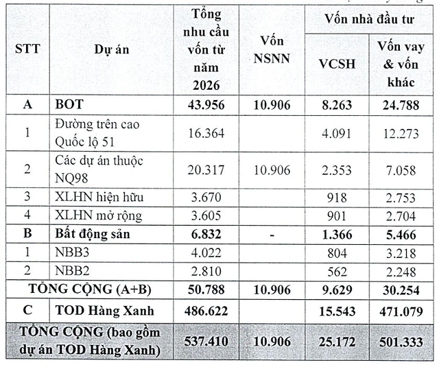 Theo kế hoạch, danh mục dự án mà CII đang chuẩn bị triển khai có tổng nhu cầu vốn gần 540,000 tỷ đồng. Trong đó, nhóm dự án hạ tầng và bất động sản giai đoạn gần cần khoảng 50,788 tỷ đồng, còn dự án đô thị theo mô hình TOD tại khu Hàng Xanh chiếm phần lớn với quy mô hơn 486,000 tỷ đồng.