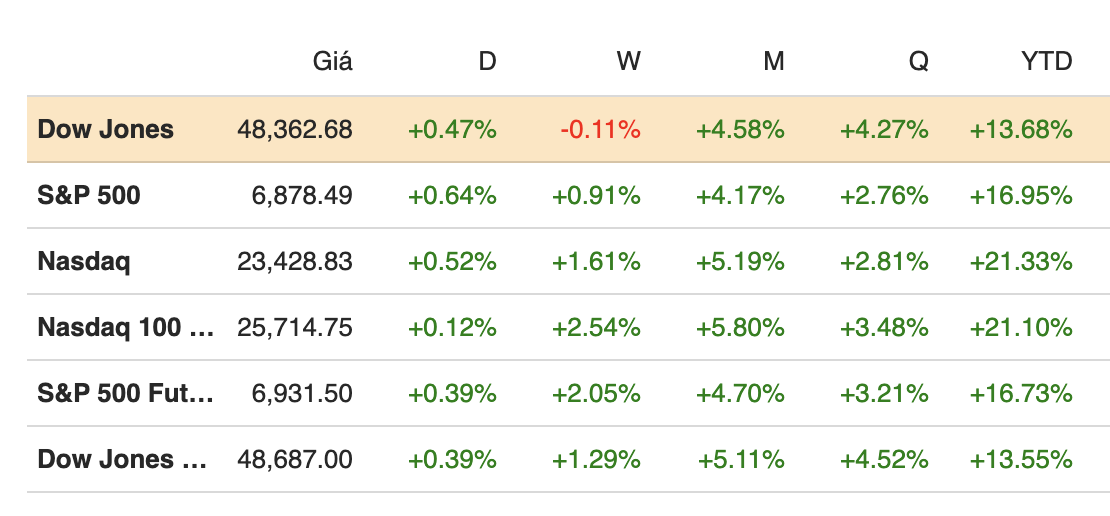 Khép phiên ngày 22/12, chỉ số S&P 500 tăng 0.64%, lên 6,878.49 điểm, ghi nhận phiên tăng thứ ba liên tiếp. Dow Jones Industrial Average tăng 227.79 điểm, tương đương 0.47%, chốt phiên tại 48.362,68 điểm. Trong khi đó, Nasdaq Composite tăng 0.52%, lên 23,428.83 điểm.