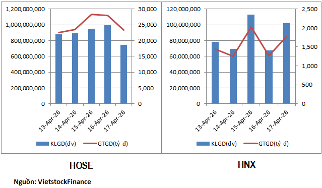Thanh khoản cải thiện nhẹ ở hai sàn niêm yết. Ở sàn HOSE, giá trị giao dịch tăng hơn 3% lên 25.1 ngàn tỷ đồng/phiên. Tuy vậy, khối lượng giao dịch sàn này lại giảm 2% về còn 892 triệu đơn vị/phiên. Ở sàn HNX, khối lượng và giá trị giao dịch tăng nhẹ với mức tăng lần lượt là 8% và 6.5%, đạt 86 triệu đơn vị/phiên và 1.55 ngàn tỷ đồng/phiên.