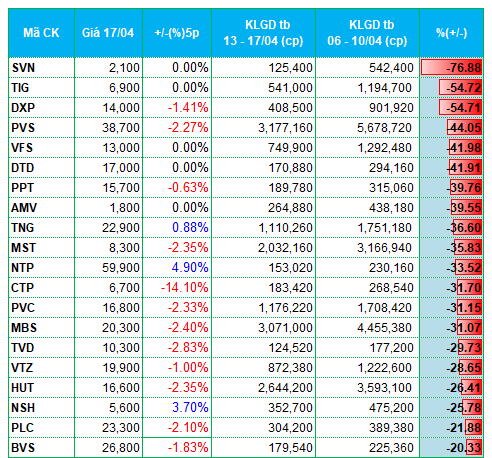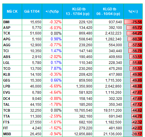 Ở chiều ngược lại, nhóm cổ phiếu tài chính (ngân hàng, chứng khoán) lại không được dòng tiền ưu ái. Loạt cổ phiếu chứng khoán như TCX, TCI, FTS, VFS, MBS, BVS ghi nhận khối lượng giao dịch giảm từ 20 - 60% so với tuần trước. Tương tự, nhiều mã ngân hàng góp mặt ở nhóm giảm mạnh thanh khoản cả hai sàn như KLB, LPB, TCB, MBB.