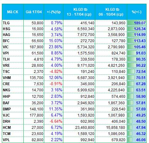 Thanh khoản cải thiện nhẹ trong tuần giao dịch 13 - 17/04. Dòng tiền phân hóa giữa các nhóm ngành, trong đó, nhóm bất động sản và thép là hai nhóm được ưu ái.