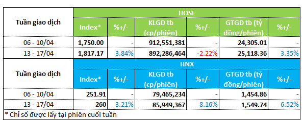 Thị trường có nhịp tăng điểm trong tuần 13 - 17/04. VN-Index tăng gần 4% lên 1,817 điểm. HNX-Index tăng 3.2% lên mức 260 điểm.