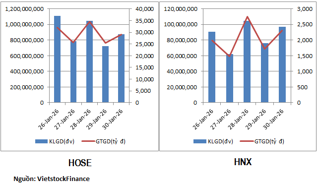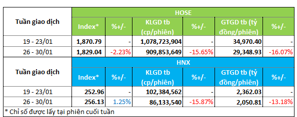 Tuần giao dịch cuối tháng 1, thị trường ghi nhận diễn biến khá ảm đạm về điểm số và thanh khoản. Dòng tiền suy yếu ở cả hai sàn HOSEHNX. Trong đó, khối lượng và giá trị giao dịch sàn HOSE giảm ở mức 16%, còn 910 triệu đơn vị/phiên và 29.3 ngàn tỷ đồng/phiên. Ở sàn HNX, khối lượng giao dịch có mức giảm 16% về 86 triệu đơn vị/phiên và giá trị giao dịch giảm 13% còn hơn 2 ngàn tỷ đồng/phiên.