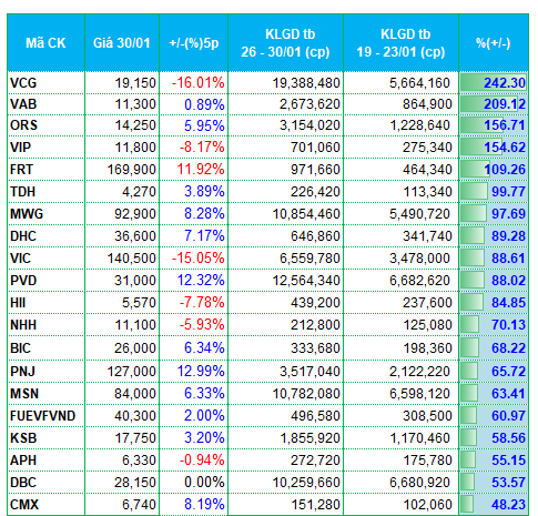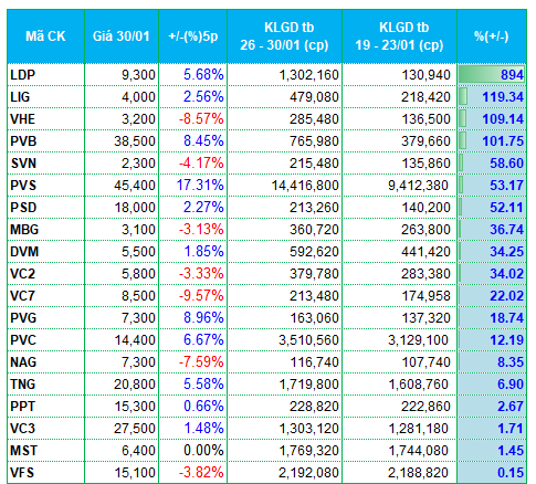 Nhóm xây dựng cũng có diễn biến hút tiền. VCG có khối lượng giao dịch tăng tới 240% so với tuần trước, đạt 19.4 triệu đơn vị/phiên. Các cổ phiếu khác như LIG, VC2, VC7, MST cũng nằm trong nhóm tăng mạnh thanh khoản.