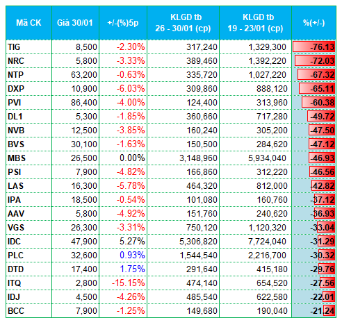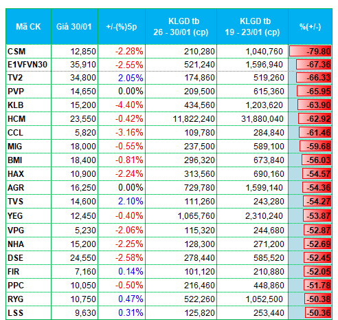 Hàng loạt cổ phiếu ở nhóm bảo hiểm (MIG, BMI, PVI) hay các mã chứng khoán (HCM, AGR, TVS, DSE, BVS, MBS, PSI) lọt top giảm mạnh khối lượng giao dịch trong tuần cuối tháng 1, mức giảm từ 45 - 60%.