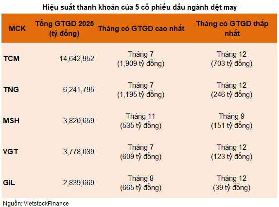 Thanh khoản ngành dệt may trong năm 2025 cho thấy dòng tiền mang tính tập trung cực cao, thay vì lan tỏa trên diện rộng. 5 mã dẫn dắt gồm TCM, TNG, VGT, GIL và MSH ghi nhận tổng giá trị giao dịch hơn 31,213 tỷ đồng, chiếm tới 92.3% tổng giá trị giao dịch toàn ngành.