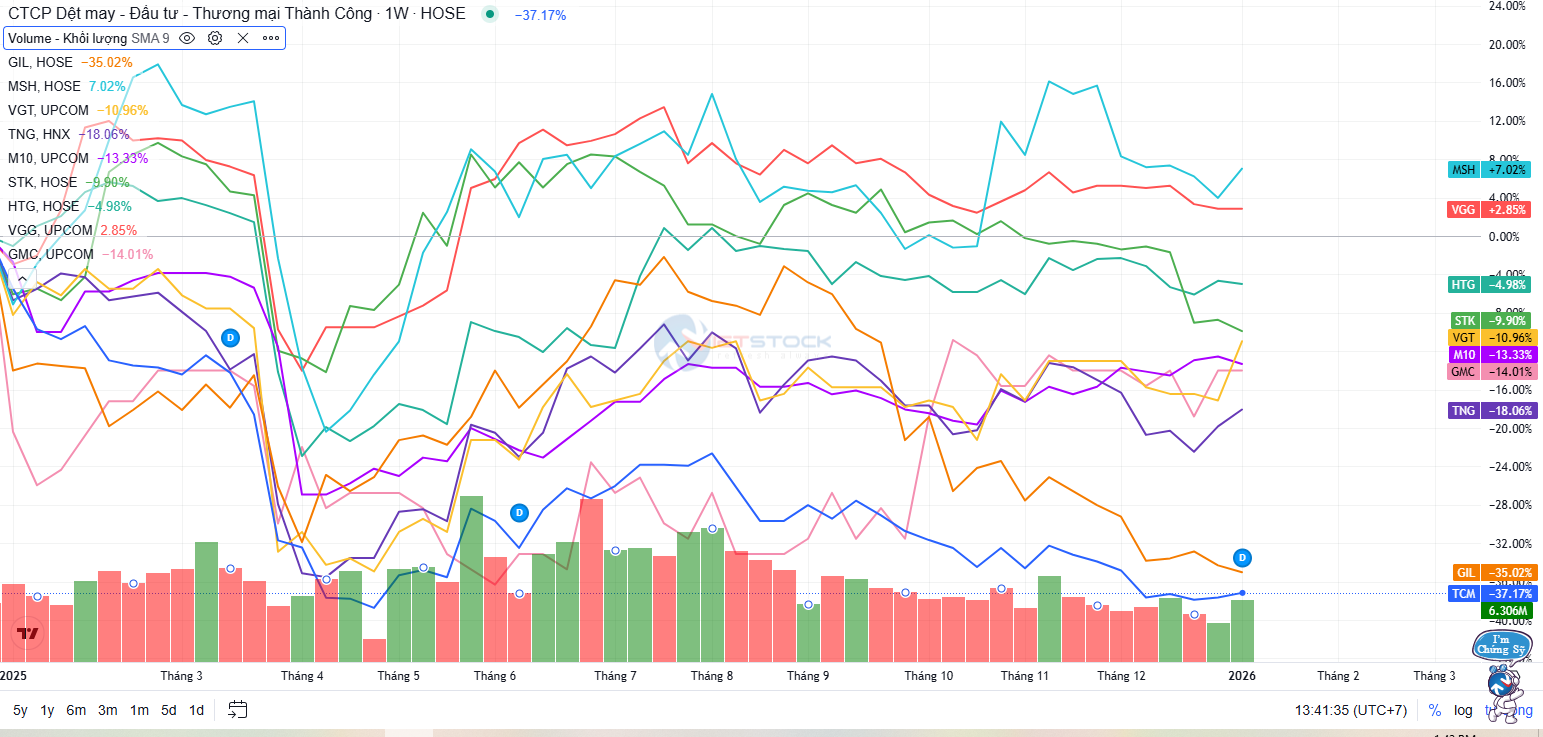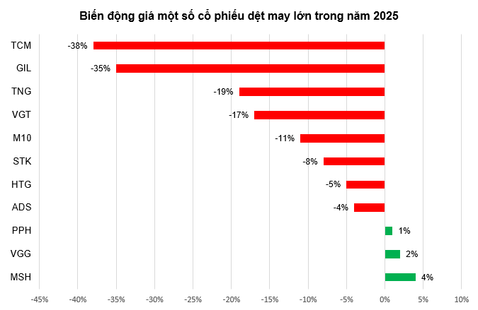 Nhìn lại năm 2025, cổ phiếu dệt may là một trong những nhóm lệch nhịp rõ nét nhất so với thị trường chung. Dù tiếp tục giữ vai trò trụ cột xuất khẩu với kim ngạch ước đạt 46 tỷ USD, tăng 5.6% so với năm trước, nhóm cổ phiếu này gần như đứng ngoài đà tăng chung, khi phần lớn mã giảm giá hoặc chỉ dao động trong biên độ hẹp.