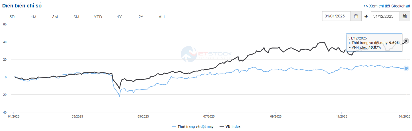 Sự lệch nhịp thể hiện rõ qua hiệu suất toàn ngành. Trong khi VN-Index tăng gần 41% trong năm 2025, chỉ số thời trang và dệt may chỉ tăng 9.69%, phản ánh sự thay đổi đáng kể trong kỳ vọng của thị trường đối với triển vọng ngành.