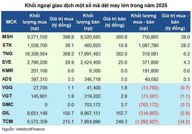 Ở góc độ dòng vốn ngoại, bức tranh cũng không mang nhiều ý nghĩa hỗ trợ. Trong bối cảnh khối ngoại bán ròng kỷ lục hơn 121,000 tỷ đồng trên toàn thị trường năm 2025, giá trị mua ròng chưa tới 31 tỷ đồng tại nhóm dệt may là quá nhỏ để tạo tác động.