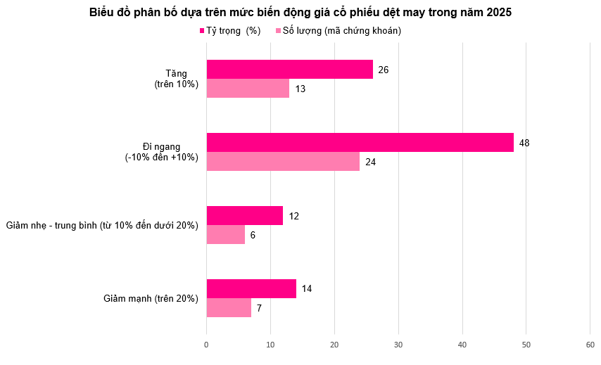 Tác động của cú sốc thuế quan mang tính toàn ngành, thể hiện rõ qua phân bố biến động giá của 50 cổ phiếu dệt may niêm yết. Theo dữ liệu từ VietstockFinance, kết thúc năm 2025, có tới 25 mã giảm giá, chiếm một nửa số lượng khảo sát. Trong đó, 14% số cổ phiếu giảm sâu trên 20%, và 12% giảm trong khoảng 10-20%.
