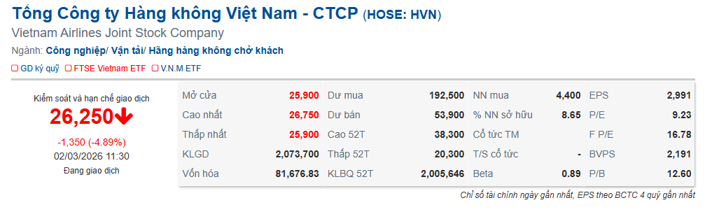 Cổ phiếu các hãng hàng không Việt Nam giảm mạnh trong phiên 02/03, cùng xu hướng chung của ngành hàng không châu Á khi cuộc xung đột ở Iran đẩy giá năng lượng - chiếm tỷ trọng lớn trong chi phí hoạt động của các hãng bay - tăng vọt.