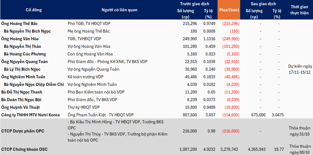 Cách đây không lâu, VDP cũng ghi nhận hai giao dịch cổ phiếu đáng chú ý. Gần nhất là trường hợp CTCP Dược phẩm OPC bán thỏa thuận toàn bộ 216,000 cp trong ngày 31/10. Ngược lại, CTCP Chứng khoán DSC mua thỏa thuận gần 3.3 triệu cp trong ngày 08/10, qua đó trở thành cổ đông lớn nắm giữ 19.77% vốn tại VDP.
