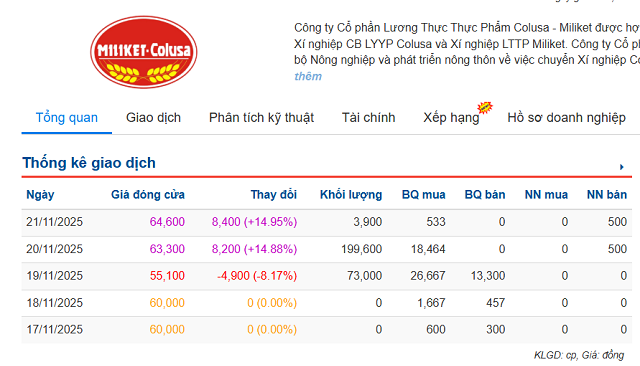 Hai phiên giao dịch 20 và 21/11, cổ phiếu CMN của CTCP Lương thực Thực phẩm Colusa - Miliket (UPCoM: CMN) liên tiếp tăng hết biên độ, ghi nhận thanh khoản đột biến.