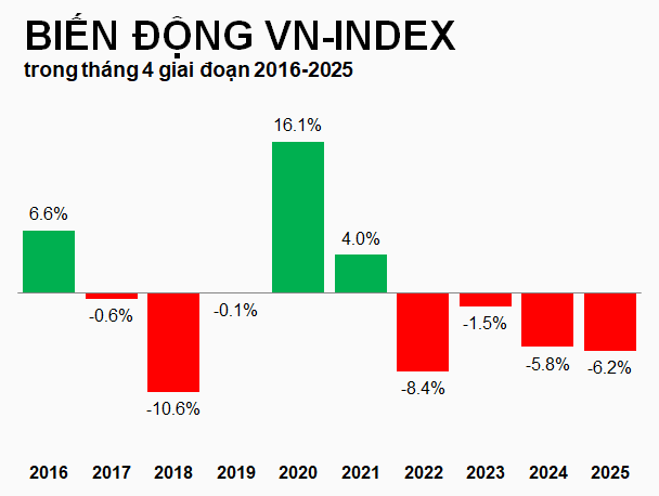 Điểm khác biệt của tháng 4 năm nay so với cùng kỳ các năm trước là việc thị trường đã điều chỉnh mạnh trong tháng 3/2026, với mức giảm 11% - một nhịp giảm đủ sâu để tạo ra cơ hội giao dịch ngắn hạn cho những ai vẫn lạc quan.