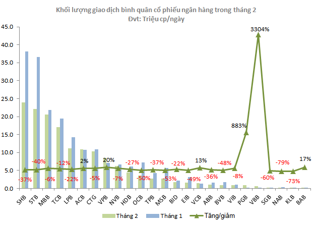 Ngược dòng, số ít nhà băng có thanh khoản tăng như VPB (+20%), VCB (+13%), BAB (+17%)…. Đáng chú ý là thanh khoản VBB trong tháng 2 có bước nhảy vọt lên mức hơn nửa triệu cp được giao dịch trong 1 ngày, gấp 34 lần tháng trước.