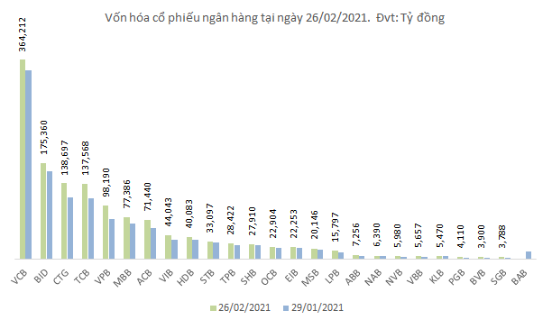 Trong diễn biến khởi sắc của thị trường, giá trị vốn hóa của nhóm ngân hàng cũng tăng hơn 151,281 tỷ đồng, lên mức 1.36 triệu tỷ đồng (tính đến phiên 26/02), tương đương tăng 13% so với mức 1.21 triệu tỷ đồng của phiên cuối tháng 1.