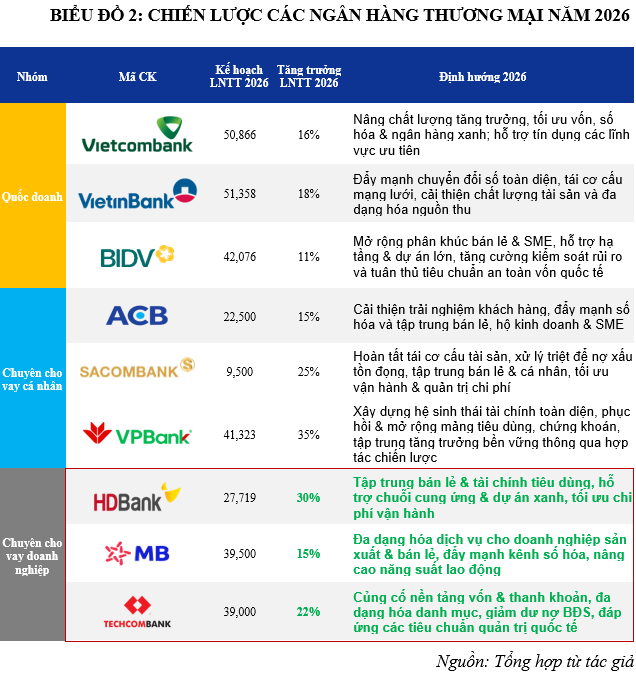 Nhìn tổng thể, chiến lược của các ngân hàng trong năm 2026 cho thấy sự khác biệt rõ rệt giữa các mô hình kinh doanh. Nhóm ngân hàng tập trung vào doanh nghiệp như TCB, MBB và HDB đặt mục tiêu tăng trưởng tương đối cao nhưng vẫn duy trì định hướng ổn định, tập trung vào mở rộng hệ sinh thái khách hàng và tăng thu nhập dịch vụ. Trong bối cảnh mục tiêu tăng trưởng tín dụng toàn ngành khoảng 15%, khả năng đạt được các kế hoạch lợi nhuận này sẽ phụ thuộc vào chiến lược tăng trưởng tín dụng, duy trì chất lượng tài sản và kiểm soát chi phí dự phòng.
