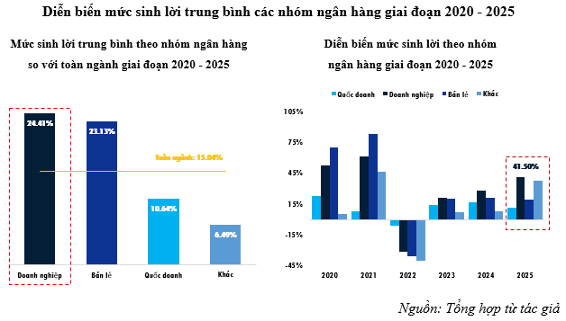 Nhìn lại hiệu suất sinh lời trong quá khứ cho thấy nhóm ngân hàng tập trung khách hàng doanh nghiệp thường đạt kết quả vượt trội so với mặt bằng chung của ngành. Trong giai đoạn 2020 - 2025, mức sinh lời trung bình của nhóm này đạt khoảng 24,41%, cao hơn đáng kể so với mức trung bình toàn ngành khoảng 15,04%. Diễn biến theo từng năm cũng cho thấy sự chuyển dịch đáng chú ý. Trong giai đoạn 2020 và 2021, khi tín dụng bán lẻ tăng trưởng mạnh, nhóm ngân hàng bán lẻ thường có hiệu suất sinh lời cao hơn. Tuy nhiên từ năm 2023 trở đi, khi tín dụng cá nhân suy giảm và nhu cầu vốn của doanh nghiệp dần phục hồi, các ngân hàng có danh mục tín dụng tập trung vào doanh nghiệp lại bắt đầu dẫn đầu về mức sinh lời trên thị trường, đạt mức khoảng 41.50% trong năm 2025, cao hơn gấp đôi so với nhóm bán lẻ.