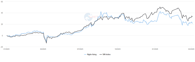 Diễn biến chỉ số ngân hàng và VN-Index từ đầu năm 2025 đến đầu tháng 4/2026