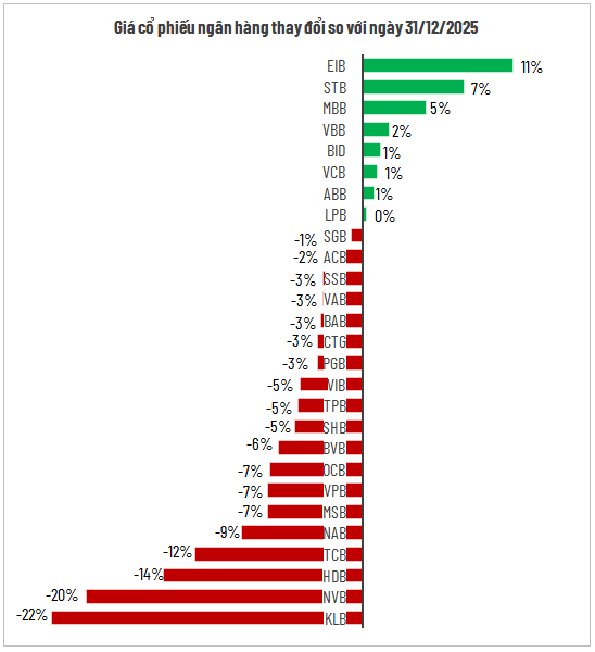 Tác động từ chiến sự Trung Đông trong tháng 3 cũng phản ánh rõ nét vào hiệu suất cổ phiếu ngân hàng trong quý 1/2026. Kết thúc quý, EIB là mã tăng mạnh nhất với mức tăng 11%, tiếp đến là STB tăng 7%, MBB tăng 5% và VBB tăng 2%. Trong khi đó, hai “ông lớn” BID và VCB – từng bứt phá trong tháng 1 đã thu hẹp đà tăng, chỉ còn tăng khoảng 1% sau ba tháng đầu năm.