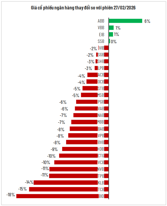 Diễn biến tiêu cực lan rộng khi hơn 85% mã ngân hàng giảm giá, kéo mặt bằng vốn hóa đi xuống. Đáng chú ý, BID là cổ phiếu giảm mạnh nhất với mức sụt 18%, trong khi hai “ông lớn” còn lại là VCB và CTG cùng chung mức giảm 10%.