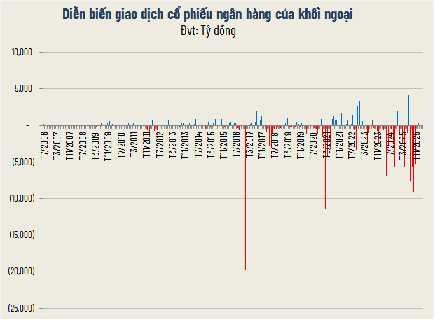 Diễn biến trong tháng 3 cho thấy ngay cả nhóm cổ phiếu trụ cột như ngân hàng cũng không tránh khỏi sức ép từ các yếu tố khó lường, khi dòng vốn ngoại có xu hướng rút lui rõ nét.