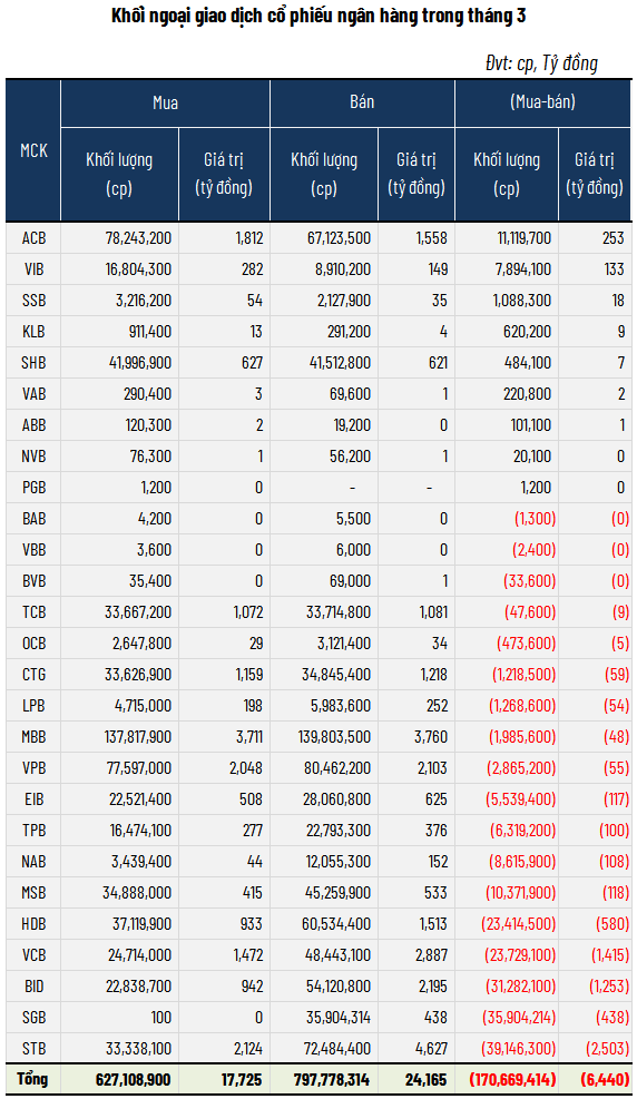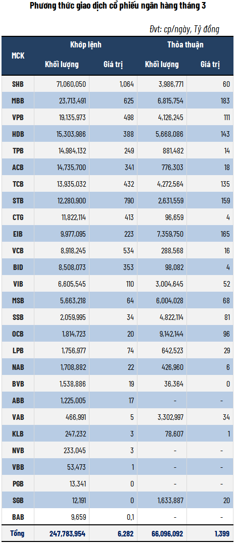 Tính cả giao dịch thỏa thuận, mỗi phiên có khoảng 314 triệu cp ngân hàng được chuyển giao, tăng 5% so với tháng 2, trong khi giá trị giao dịch giảm nhẹ 4%, còn khoảng 7,681 tỷ đồng/ngày.