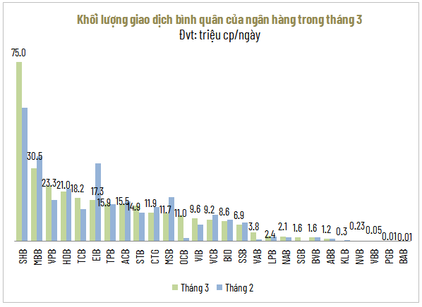 Về thanh khoản, SHB tiếp tục dẫn đầu toàn ngành với bình quân khoảng 71 triệu cp khớp lệnh mỗi phiên, cùng gần 4 triệu cp giao dịch thỏa thuận, tăng lần lượt 35% và 11% so với tháng trước. Ở chiều ngược lại, BAB là mã có thanh khoản thấp nhất khi khối lượng giao dịch bình quân chưa tới 10,000 cp/ngày, giảm 29% so với tháng 2.