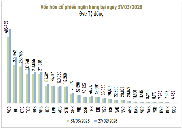 Bất ổn địa chính trị gia tăng làm dấy lên lo ngại về áp lực lạm phát quay trở lại, qua đó đẩy chi phí vốn lên cao. Diễn biến này khiến sức hấp dẫn của các tài sản rủi ro suy giảm, đồng thời gia tăng áp lực lên thị trường chứng khoán. Trong bối cảnh này, vốn hóa toàn ngành ngân hàng đã “bốc hơi” gần 259,000 tỷ đồng so với cuối tháng 2, tương ứng mức giảm khoảng 9%.