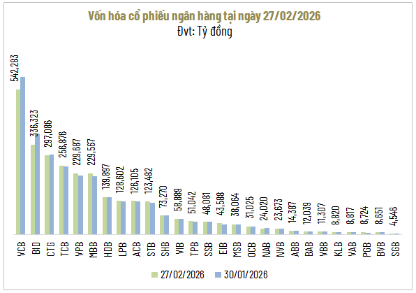 Diễn biến tháng 2 cho thấy đà tăng của nhóm ngân hàng quốc doanh đã tạm thời chững lại, trong khi dòng tiền có xu hướng phân hóa sang một số cổ phiếu tư nhân có câu chuyện riêng.